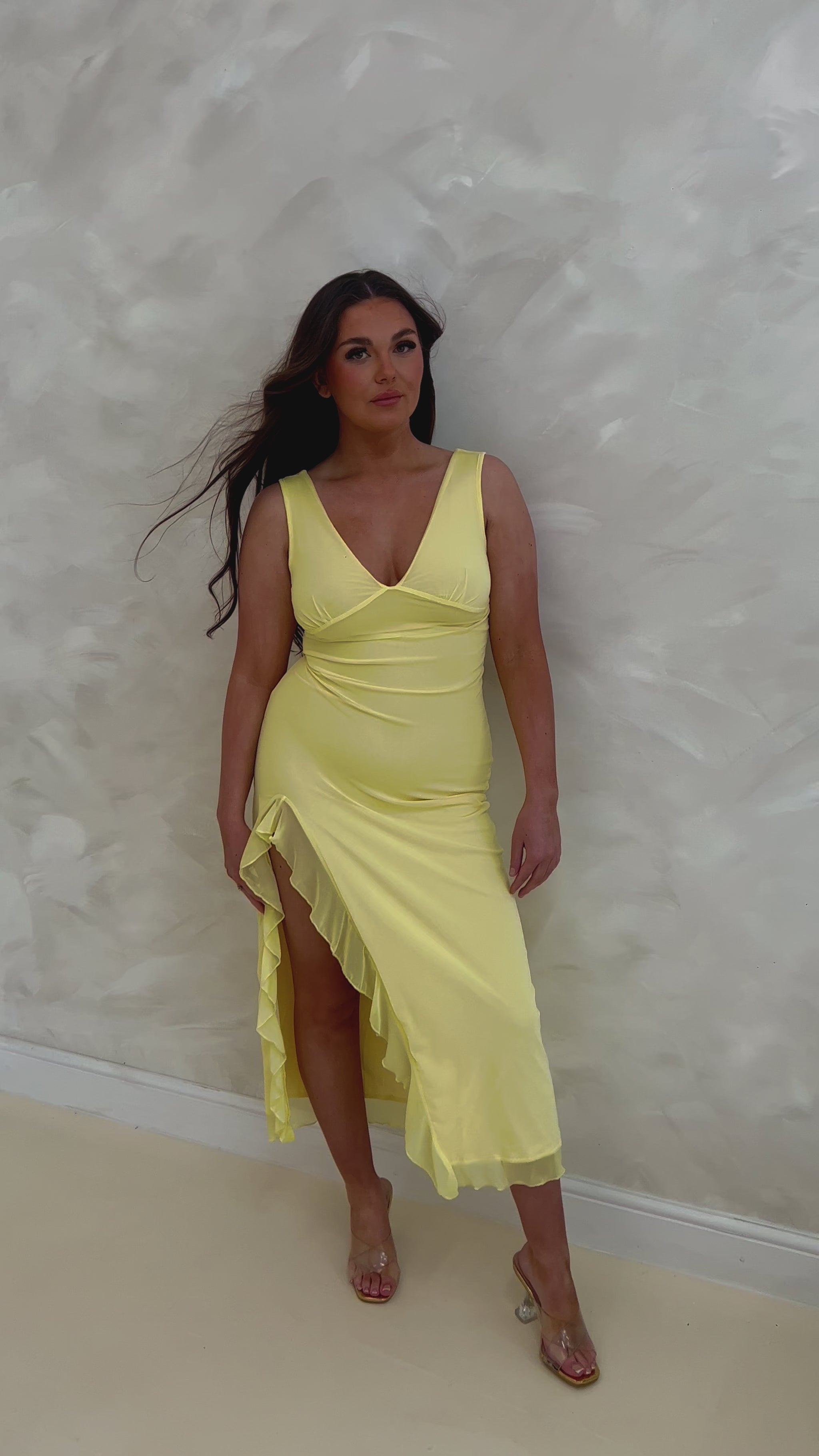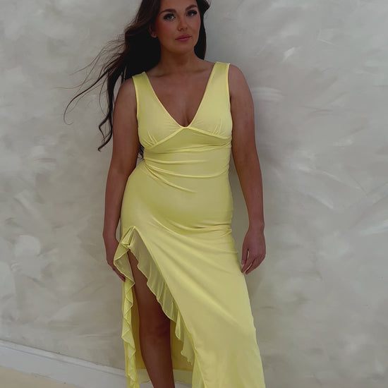 Introducing The Lemon Dress - a stunning yellow dress with side split and feminine ruffle detail. Elevate your style with this eye-catching piece perfect for any occasion. Made from high-quality materials, this dress is both beautiful and comfortable. Make a statement in 100% yellow!